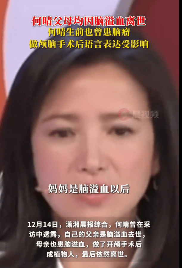 12月14日,潇湘晨报综合,何晴曾在采访中透露,自己的父亲是脑溢血去世,母亲也患脑溢血,做了开颅手术后成植物人,最后依然离世。12月13日何晴在北京因病离世,享年61岁,何晴曾于2015年确诊脑瘤,随后接受手术治疗,后期还做过颅脑手术,语言表达受影响。