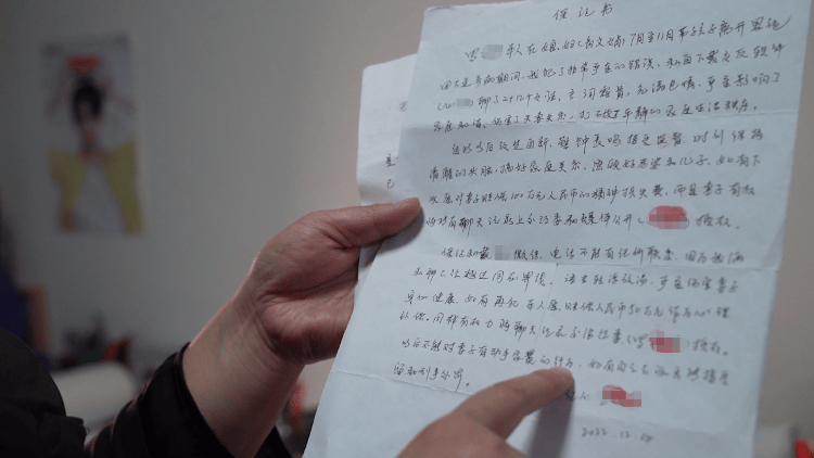 商文娟向记者展示此前丈夫家暴她后写下的保证书。