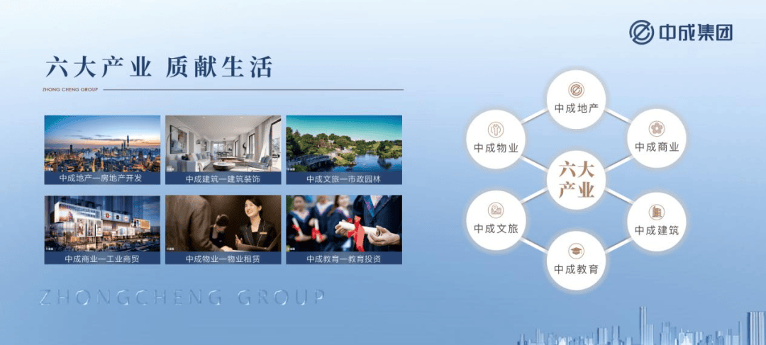 中成集团始终秉承精耕本土的发展理念,坚持给客户提供全生命周期的幸福生活,坚持“像造汽车一样造房子”、“质量就是生命线”的原则,为客户打造最满意、最舒适、最放心的品质好房。集团旗下涵盖六大产业:地产、物业、文旅、商业、教育和建筑,是一家集六大产业于一体,跨行业、跨地域大型民营企业集团。