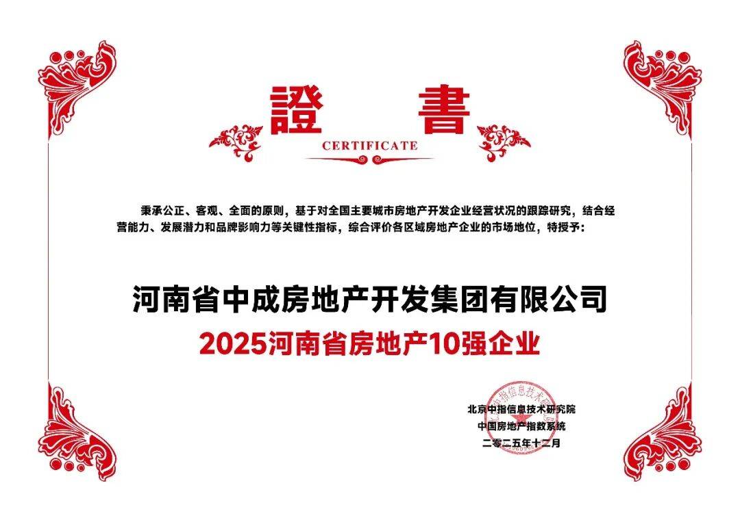中成集团凭借稳健的经营和良好的市场表现荣膺“2025年河南省房地产10强企业”、“2025年洛阳市房地产市场地位领先企业”奖项。