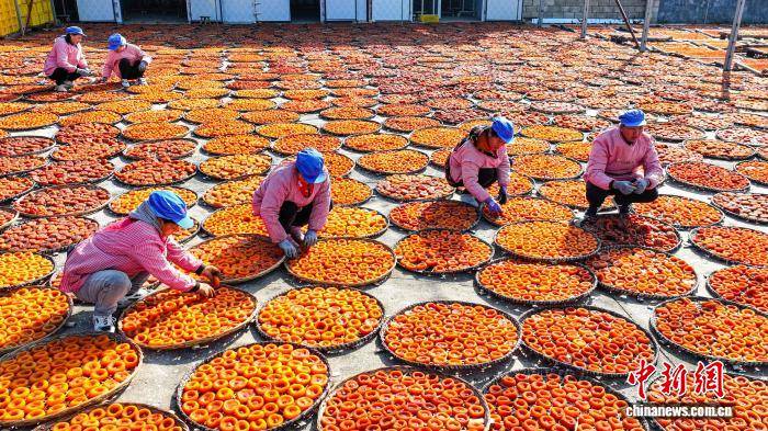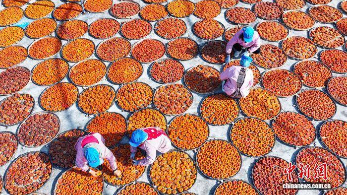 图为平乐县沙子镇加工企业工人在翻晒柿饼。(无人机照片)杨宗盛 摄