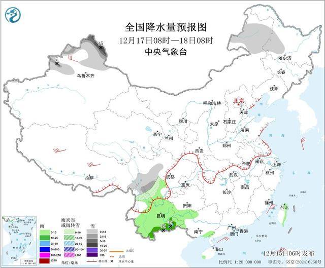 12月17日08时至18日08时,内蒙古东北部、黑龙江西南部、新疆北疆北部、川西高原中南部、云南西北部等地部分地区有小到中雪或雨夹雪,其中,新疆阿勒泰地区和伊犁河谷局地有大到暴雪(10~15毫米);西南地区南部、广西西北部和东南部等地部分地区有小到中雨,其中,云南东南部局地有大雨(25~35毫米)。新疆沿天山地区、西藏中北部等地部分地区有5~7级风;台湾海峡、巴士海峡、南海东北部和中东部海域有6~7级风、阵风8级。