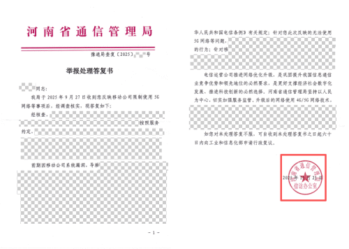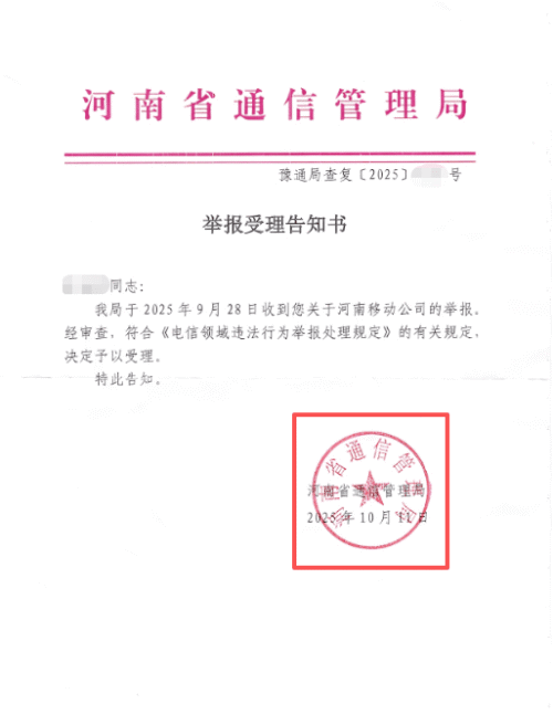 公章不一致引发质疑:用户指出,其获得的《举报受理告知书》加盖的是“河南省通信管理局”公章,而后续收到的《举报处理报答复书》却盖的是“河南省通信管理局信访办公室”的章。用户认为此举违反公章使用规定,质疑处理过程的规范性与严肃性。