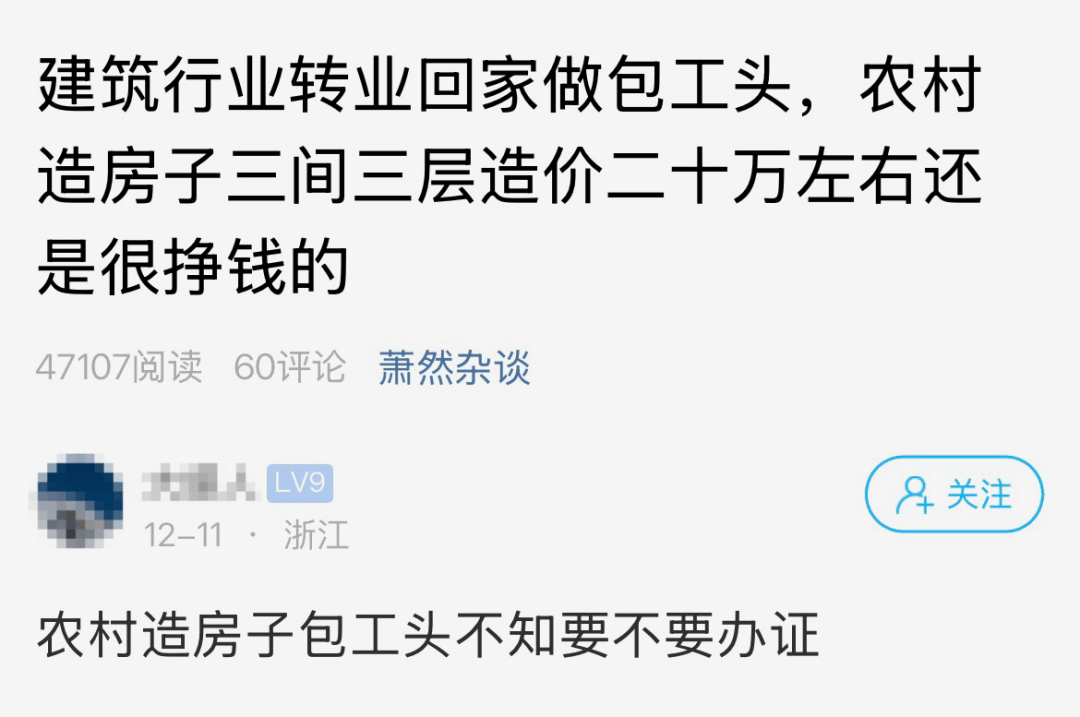 有网友发帖说,这两年萧山农村建房火热,转行做包工头,可能是个机会——