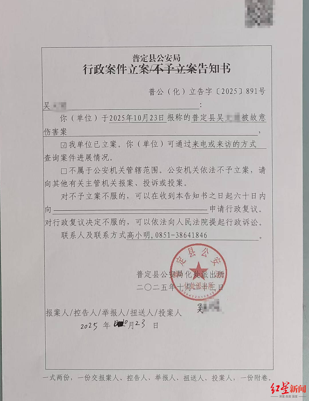 行政案件立案告知书则表明,对小吴报称的被故意伤害案,化处派出所已立案。