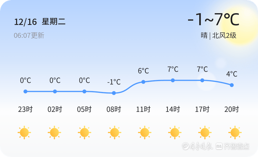 今天是12月16日,星期二,农历十月廿七。聊城市区天气晴朗,气温在-1℃到7℃之间,北风2级,空气湿度高达93%。目前空气质量指数为132,属于中度污染,建议敏感人群减少户外活动。市民出行时请注意保暖,并做好防护措施。此外,由于湿度较大,路面可能有结冰现象,驾车请注意减速慢行。