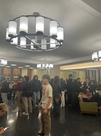 正在布朗大学访问的中国留学生梁同学告诉红星新闻记者,他和其他同学在经过漫长等待后终于被放出图书馆。他们深夜坐上校车,被警车护送着转移到学校体育馆。梁同学表示,体育馆内有水和食物,感觉很安全。体育馆外不仅有“超多警车”进行警戒,天上也有直升机在盘旋。他和同学们进入体育馆之前,还被警察进行了严格的搜身。