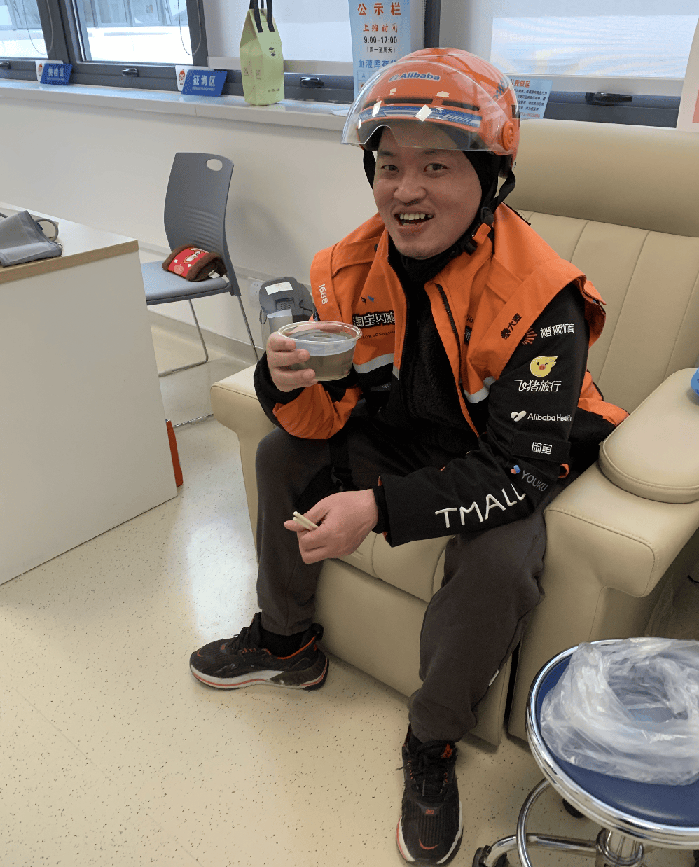 当时有个外卖小哥来给献血屋的工作人员送餐,罗女士说,她有点“疏离型人格”,但是当时不知道怎么回事,就对外卖小哥开口,“你能帮帮我吗?”在向外卖小哥解释情况后,小哥问了一嘴,“你们在这里住院吗”,得到罗女士肯定的回答后,外卖小哥说可以,就坐下来跟医生说要帮他们献血,“我当时已经走投无路了,他没有多说一句话就答应了,我当时特别感动。”