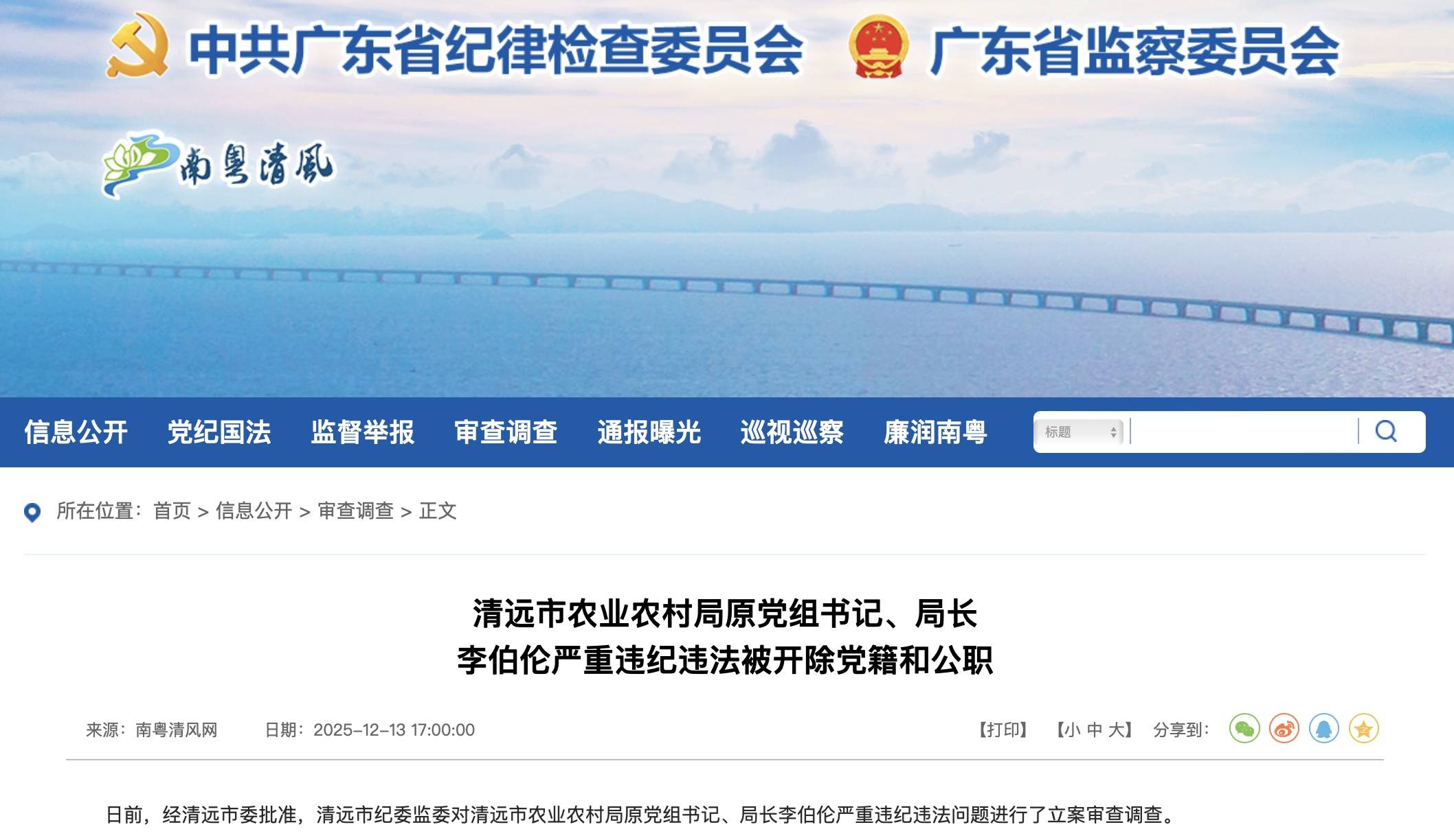 据广东省纪委监委官网消息,日前,经清远市委批准,清远市纪委监委对清远市农业农村局原党组书记、局长李伯伦严重违纪违法问题进行了立案审查调查。