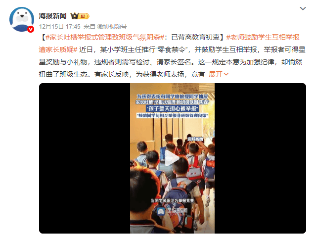 近日,某小学班主任推行“零食禁令”,并鼓励学生互相举报,举报者可得星星奖励与小礼物,违规者则需写检讨、请家长签名。这一规定本意为加强纪律,却悄然扭曲了班级生态。有家长反映,为获得老师表扬,竟有学生趁同学不在时偷偷翻查抽屉、书包,搜寻“证据”。更令人担忧的是,部分学生为争夺奖励或排挤竞争对手,不惜捏造事实、栽赃陷害。三年级学生阿旺就因举报同学被父亲严肃批评,家长直言此类行为已背离教育初衷。“班级氛围变得‘阴森’,孩子整天担心被举报。”一位家长坦言,同学之间信任感荡然无存,彼此提防、猜忌取代了原有的互助与友爱。这种“举报式管理”非但未能促进班级自律,反令学生陷入惶恐与对立。