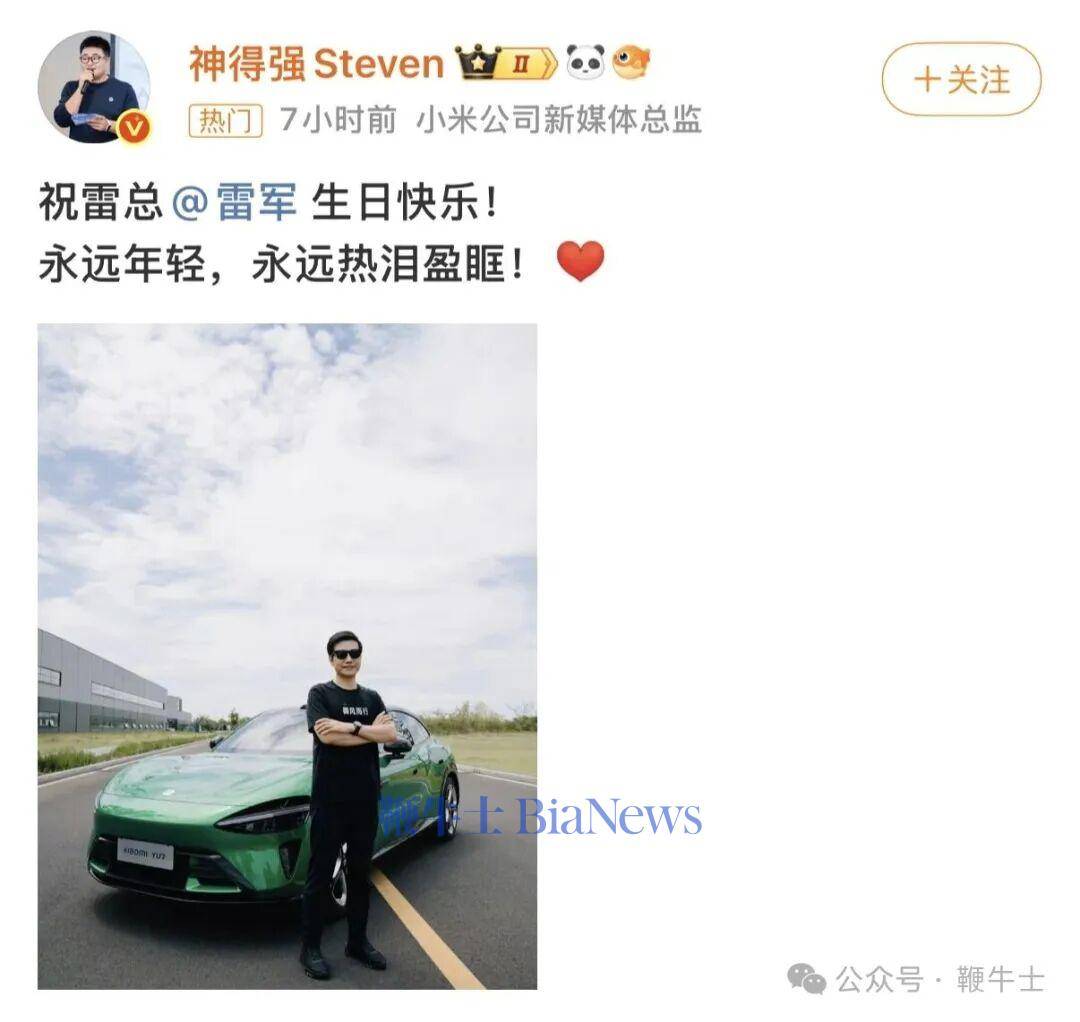 他发文称,“祝雷总生日快乐,永远年轻,永远热泪盈眶!”并附上雷军与小米YU7的合影。