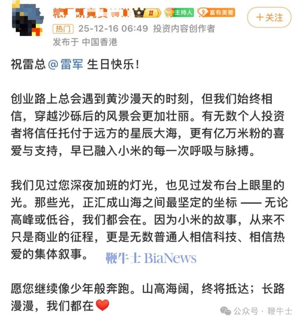 12月16日,今日是小米集团创始人雷军的生日。小米公司新媒体总监已早早送上祝福。