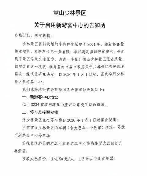 近日,多名游客发帖称,河南嵩山少林景区发布通知,称自2026年1月1日起,所有游客车辆只能停在新的游客中心停车场,然后转乘50元接驳车往返景区。不少游客表示,景区内本来就有观光车,如今景区大门停车场停止使用,要求游客还要多乘坐一趟接驳车,此举究竟是为方便游客还是变相增收?记者从河南嵩山少林文化旅游有限公司获悉,景区此前已多次启动接驳车服务。目前,关于停止使用原停车场,正式启用新游客中心的相关方案将暂缓执行,为满足游客的需求,正在做调整。(据12月15日上游新闻报道)