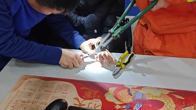 了解情况后,消防员立即对男孩被卡的手指进行检查。发现手指被戒指牢牢卡住,手指因血液循环不畅已出现明显红肿。为确保救援安全,消防员小心翼翼地将塑料垫片塞进戒指与手指之间的缝隙中,以此隔离工具与皮肤,避免剪切过程中造成二次伤害,随后消防员用尖嘴钳紧紧夹住戒指,由另一名消防员操作剪切钳进行剪切,并时刻关注男孩的反应,安抚男孩的情绪。
