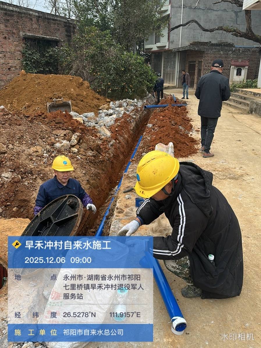 在七里桥镇早禾冲村自来水入户配套安装现场,机械轰鸣、人忙有序,挖掘机开挖沟槽与施工人员铺设管网、安装水表等工序高效衔接,各项作业紧锣密鼓推进。“为加快工程落地,施工团队攻坚克难抢进度,目前已完成DN50及以上主管网铺设约4000米,项目总投资近百万元,全部选用耐腐蚀、使用寿命长的新型供水管材,保障供水质量与长效运行。”早禾冲村安装现场负责人聂欣介绍,前期已完成160余户水表入户安装,预计12月20日前可实现全村通水,切实解决群众用水需求。民生无小事,点滴见初心。此前,七里桥镇早禾冲村村民长期依赖井水,用水难题一直牵挂着群众的心。随着城区供水延伸工程推进,不仅将优质城区水源接入村民家中,更实现了水压稳、水量足、水质优的供水目标,彻底终结了村民“用水难”的困扰,以实实在在的民生成效回应群众期盼。