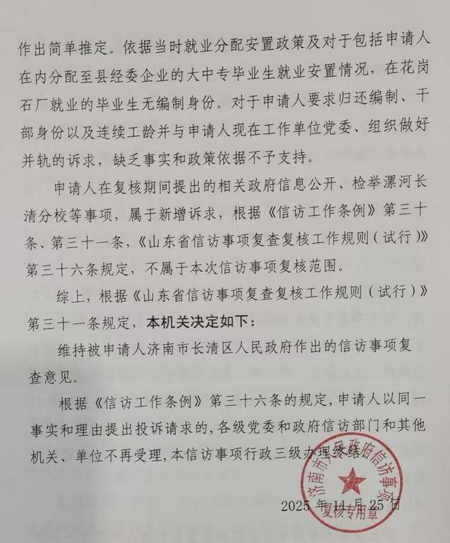 赵先生对长清区政府出具的《信访事项复查意见书》不服,遂向济南市政府提出复核申请。2025年11月25日,济南市政府就赵先生的复核申请出具的《信访事项复核意见书》显示:维持被申请人济南市长清区政府作出的信访事项复查意见。