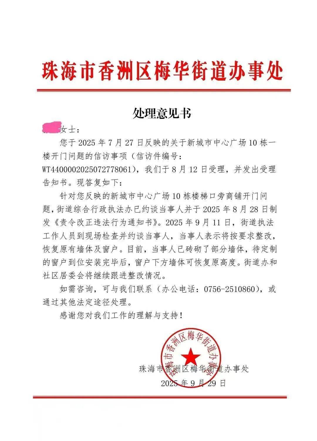 近日,珠海新城市中心广场10栋业主再次向南都记者反映,涉事一楼住户虽已按责令整改书砌起墙体并安装窗户,但该处为推拉窗仍供人员进出,实际功能并未改变。珠海市香洲区梅华街道办事处表示已现场核实并作结案处理,而业主们则认为整改只是“换了层皮”,直言是“侮辱智商”的换壳。