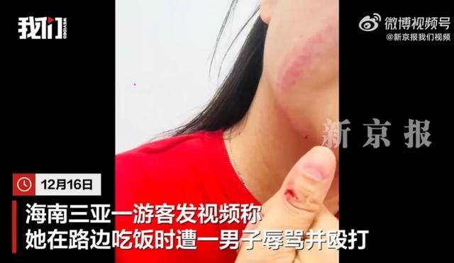 12月16日,海南三亚一名女游客发视频称,她在路边吃饭时遭一名男子辱骂殴打。