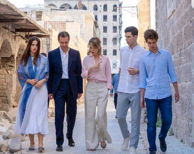 2022年,阿萨德与妻子孩子在叙利亚北部城市阿勒颇散步