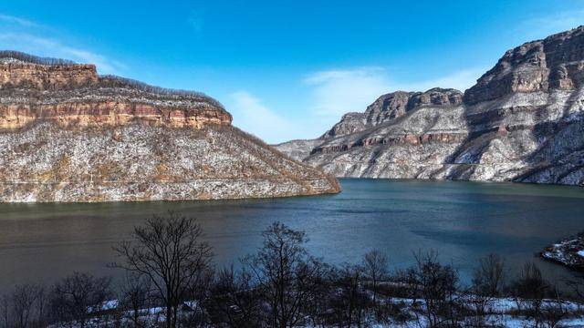 受冷空气影响,12月12日,河南安阳市林州太行大峡谷迎来今冬初雪。次日天晴,暖阳遍洒,太行大峡谷银装素裹,分外妖娆。放眼望去,白雪覆盖峰峦,红色石英砂岩与素雪相映,勾勒出雄浑轮廓;山间道路积雪铺就,沿线村落炊烟袅袅,石板房脊顶雪层如棉。澄澈湖水如翡翠流转,湖岸冰雪晶莹,碧水与雪山交相辉映;岸边林木凝霜挂雪,玉树琼枝间,山、雪、水、村相融一体,绘就一幅静谧雄奇的冬日画卷,美不胜收。