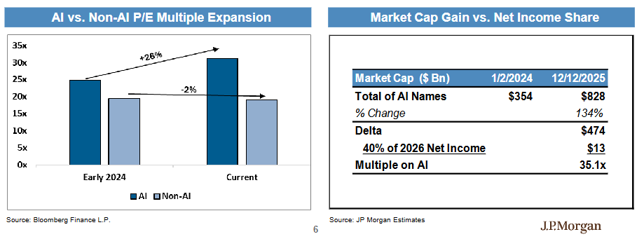分析显示,AI相关公司目前的估值溢价约为26%,这一水平相对保守。该团队估算,AI业务在2026年将占这些公司收入的约40%,对应的市盈率约为35倍,这暗示市场仅预期AI相关的可持续资本支出增长30%,远低于2024-2025年的70%增长率。