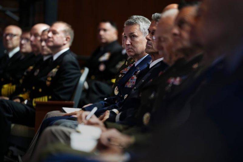 美军参谋长联席会议主席丹·凯恩(中)9月30日在弗吉尼亚州匡蒂科的海军陆战队基地同其他高级军官听取美国国防部长赫格塞思的讲话。图源:美媒