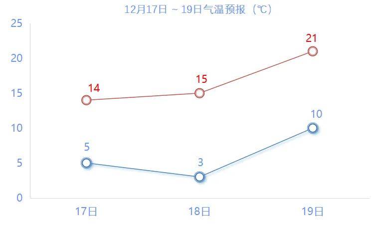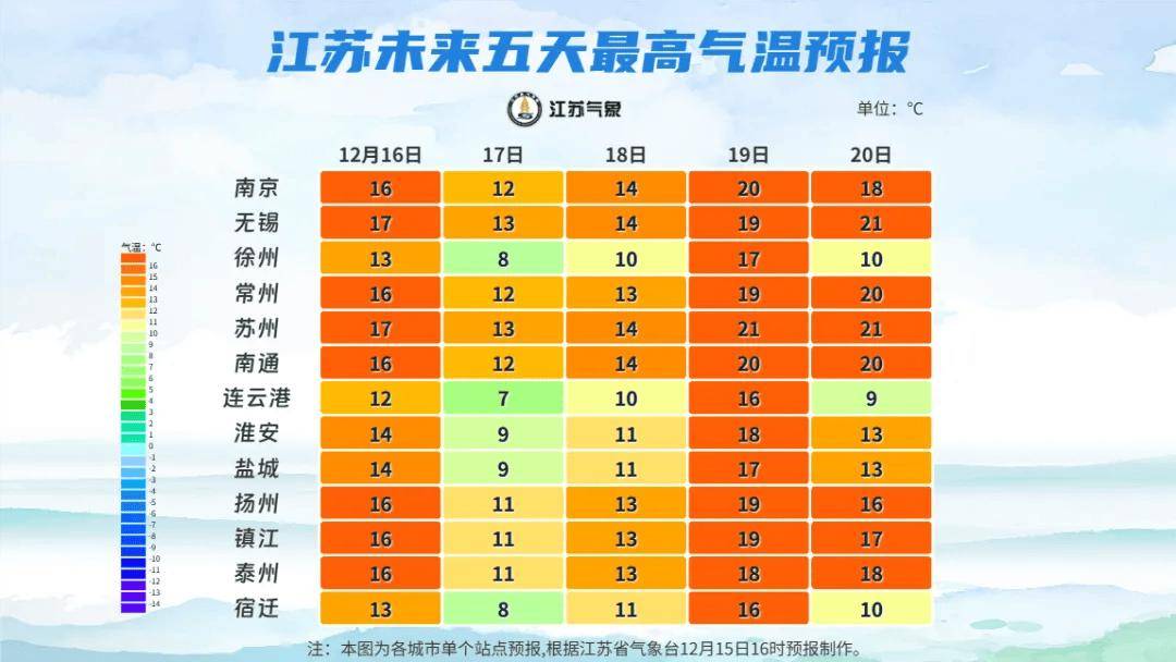 未来10天全省平均温度较常年同期偏高2℃。15日起全省气温缓慢回升;17日全省有一次弱冷空气影响过程,气温略下降;20日起全省有一次较强冷空气影响过程,48小时最低气温降幅:江淮之间北部和淮北地区8—10℃,其他地区6—8℃。
