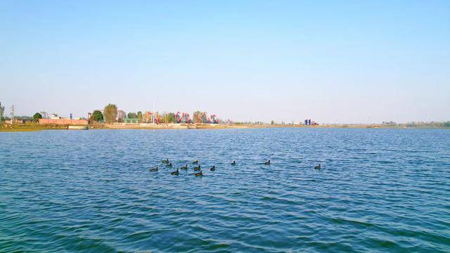 图为:12月12日,在河南油田采油二厂古城8号计量站旁的月亮湖畔,抽油机在平稳运转的同时,成群水鸟于湖面嬉戏游弋,生动展现了河南油田采油生产与生态保护相融共生的生动画面。