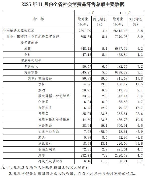 根据第五次全国经济普查结果对全省社会消费品零售总额历史数据进行了修订,2025年社会消费品零售总额月度增速按照可比口径计算。