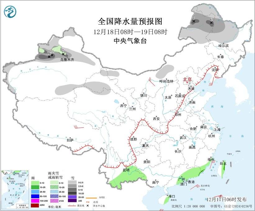 12月17日08时至18日08时,新疆北疆北部、西藏东部、川西高原北部等地部分地区有小到中雪或雨夹雪,其中,新疆阿勒泰及伊犁河谷等地部分地区有大到暴雪(10~19毫米)。西南地区南部、广西西部、台湾岛等地部分地区有小到中雨。内蒙古中部、辽东半岛等地部分地区有4~6级风,西藏北部部分地区有6~7级风。东海大部、台湾海峡、台湾以东洋面、巴士海峡、北部湾、南海大部海域将有6~7级、阵风8级的风,其中台湾海峡、巴士海峡和南海东北部的部分海域风力可达8级、阵风9~10级。