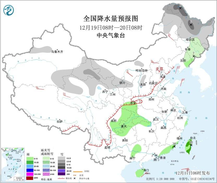 12月19日08时至20日08时,内蒙古东北部、黑龙江大部、吉林东部、辽宁东北部、新疆南疆西部山区、西北地区中东部、华北西部等地部分地区有小到中雪或雨夹雪,其中,内蒙古东北部、黑龙江中北部等地部分地区有大雪(5~8毫米)。陕西南部、辽宁东部、四川东部、重庆大部、贵州北部、湖北西部、湖南北部、广西中部、广东东南部、福建东南部、海南岛、台湾岛等地部分地区有小到中雨,局地有大雨(25~30毫米)。内蒙古西部和东北部、西藏北部、青海西部、山东半岛等地部分地区有4~6级风。渤海、渤海海峡、黄海北部和中部海域、东海南部海域、巴士海峡、南海北部海域将有6~7级、阵风8级的风。