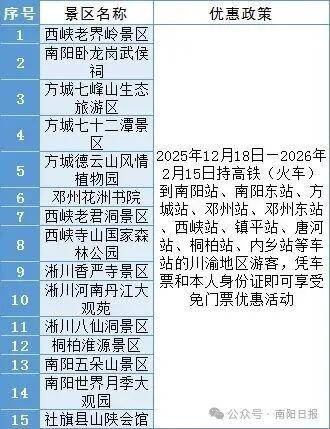 2025年12月18日—2026年2月15日持高铁(火车)票到南阳站、南阳东站、方城站、邓州站、邓州东站、西峡站、镇平站、唐河站、桐柏站、内乡站等车站的四川、重庆地区游客,凭车票和本人身份证即可到指定景点享受免门票优惠活动。