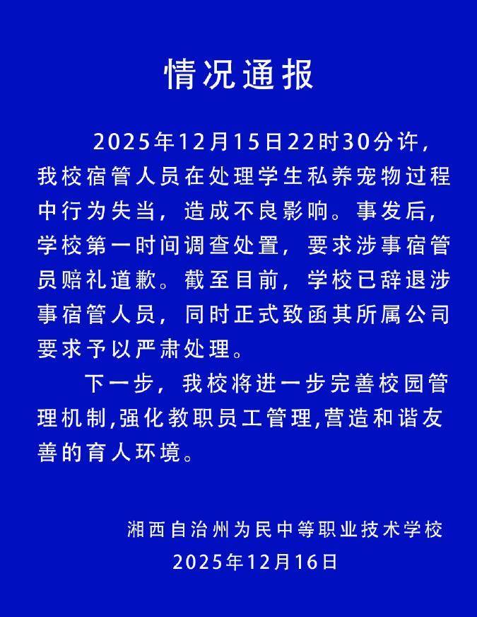 12月16日,湖南湘西为民中等职业技术学校通报:12月15日22时30分许,学校宿管人员在处理学生私养宠物过程中行为失当,造成不良影响。事发后,学校第一时间调查处置,要求涉事宿管员赔礼道歉。截至目前,学校已辞退涉事宿管人员,同时正式致函其所属公司要求予以严肃处理。(据12月16日现代快报报道)