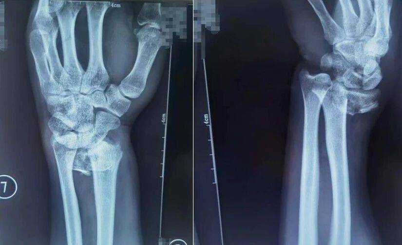 患者桡骨远端骨折,图为复位前正位、复位前侧位。图源:哈尔滨骨伤科医院