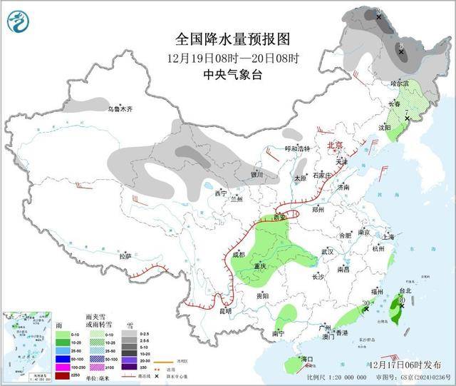 12月19日08时至20日08时,内蒙古东北部、黑龙江大部、吉林东部、辽宁东北部、新疆南疆西部山区、西北地区中东部、华北西部等地部分地区有小到中雪或雨夹雪,其中,内蒙古东北部、黑龙江中北部等地部分地区有大雪(5~8毫米)。陕西南部、辽宁东部、四川东部、重庆大部、贵州北部、湖北西部、湖南北部、广西中部、广东东南部、福建东南部、海南岛、台湾岛等地部分地区有小到中雨,局地有大雨(25~30毫米)。内蒙古西部和东北部、西藏北部、青海西部、山东半岛等地部分地区有4~6级风。渤海、渤海海峡、黄海北部和中部海域、东海南部海域、巴士海峡、南海北部海域将有6~7级、阵风8级的风。