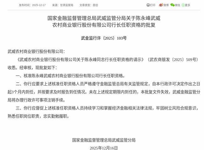 2025年12月17日,根据国家金融监督管理总局消息,《武威农村商业银行股份有限公司关于陈永峰同志行长任职资格的请示》获得通过,批复陈永峰武威农村商业银行股份有限公司行长的任职资格。