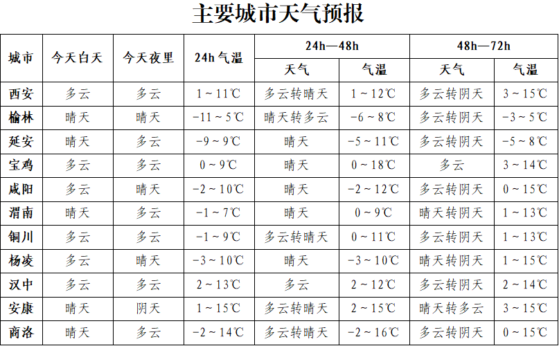今天晚上:陕北、关中东部、陕南东部晴天间多云,关中西部、陕南西部多云转阴天。陕北西部有4级左右偏南风,阵风6~7级。