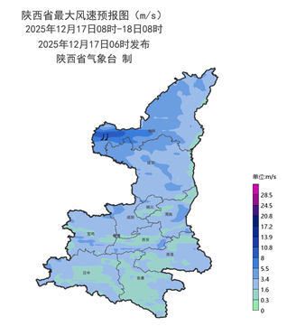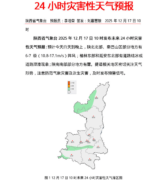 陕西省气象台2025年12月17日10时发布未来24小时灾害性天气预报:预计今天白天到晚上,陕北北部、秦巴山区部分地方有 6-7 级阵风;
