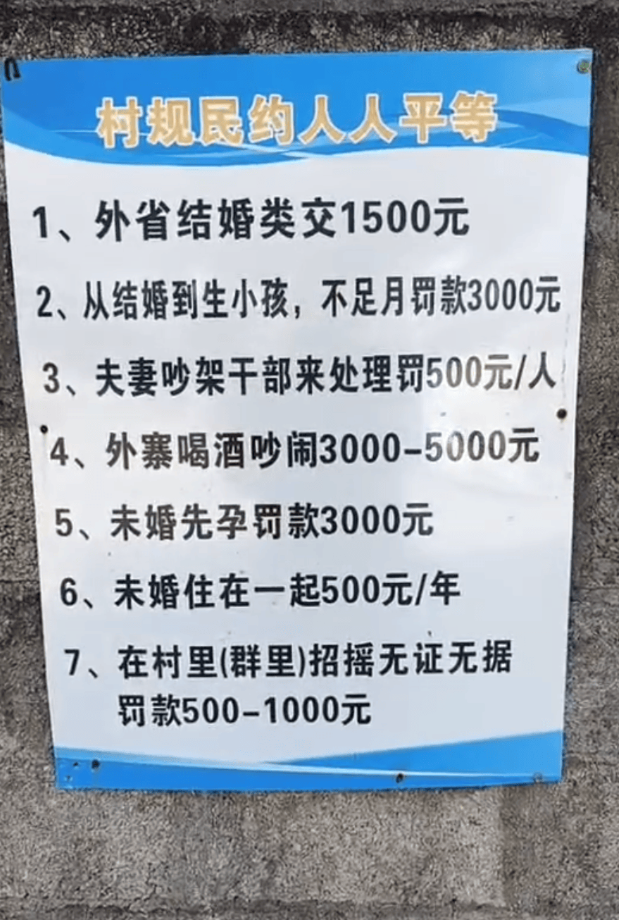 凡事皆可罚款?最近云南临沧孟定镇某村庄贴出的一张告示可谓“明码标价”:外省结婚交1500元;结婚后太快生娃罚3000元;夫妻拌嘴闹到要干部处理,一人罚500元;外寨喝酒喧哗罚3000—5000元;未婚先孕罚3000元;未婚同居一年罚500元。上面还郑重其事写着:“村规民约人人平等”。