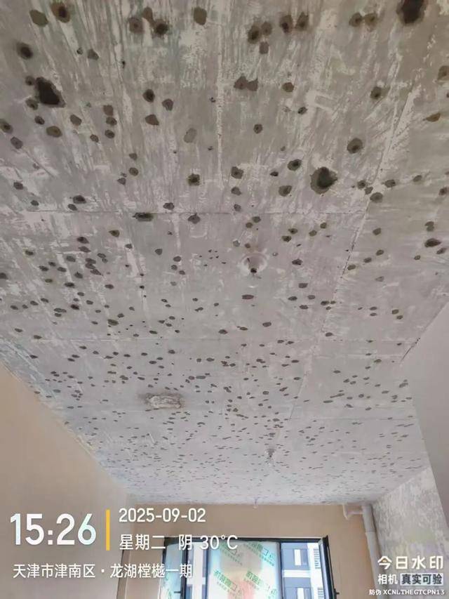 “我们也听说天津好几个小区都出现了房顶鼓包、爆点的事情,这种一般都是混凝土出问题了,掺了不该掺的东西。”