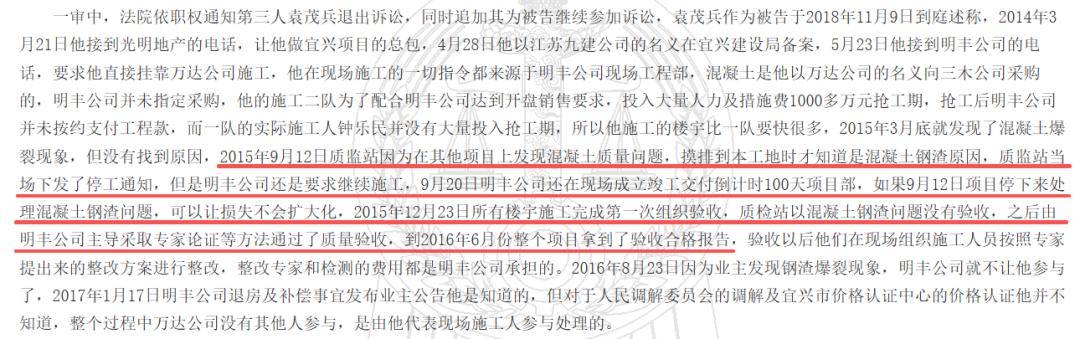 南风窗通过裁判文书网获取的“(2019)苏02民终2067号”民事判决书显示,2015年3月底,江苏宜兴市英伦尊邸项目在施工过程中就发现了混凝土爆裂现象,但没找到原因。
