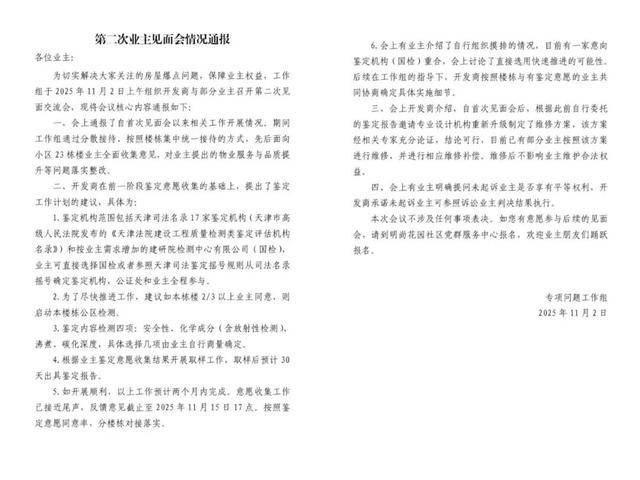 11月2日,专项问题工作组组织召开了第二次业主见面会。见面会情况通报显示:开发商在前一阶段鉴定意见收集的基础上,增加了建研院检测中心有限公司(国检)为可选择的鉴定机构;为了尽快推进工作,建议如本栋楼2/3以上业主同意,就启动本楼的公区检测;此外,开发商根据此前自行委托的鉴定报告邀请专业设计机构重新升级制定了维修方案,该方案经相关专家充分论证,结论可行,目前已有部分业主按照该方案进行维修,并进行维修补偿,维修后不影响业主维护合法权益。