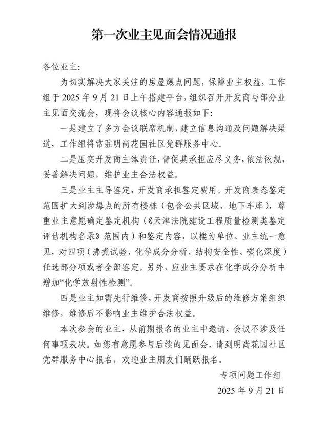 南风窗获取的当天见面会情况通报的有关内容显示:尊重业主意愿确定鉴定机构(《天津法院建设工程质量检测类鉴定评估机构名录》范围内)和鉴定内容,以楼为单位、业主统一意见,对四项(沸煮试验、化学成分分析、结构安全性、碳化深度)任选部分项或者全部鉴定。另外,应业主要求,在化学成分分析中增加“化学放射性检测”。