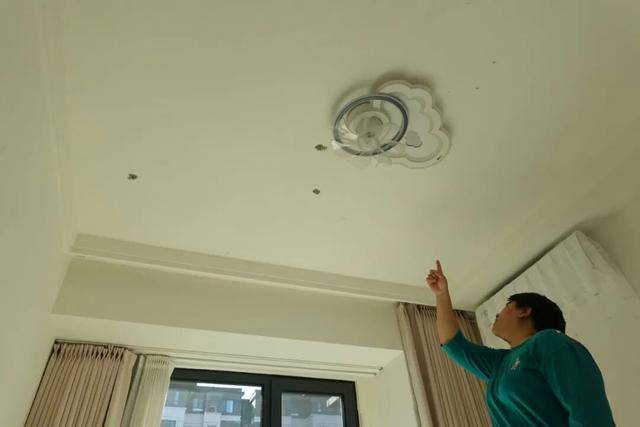 林斐丽跟物业反映后,开发商在去年10月安排人上门维修。当工人踩上梯子,打开手电筒侧面照向客厅顶板时,林斐丽发现上面的鼓包远比她平日看到的要多。