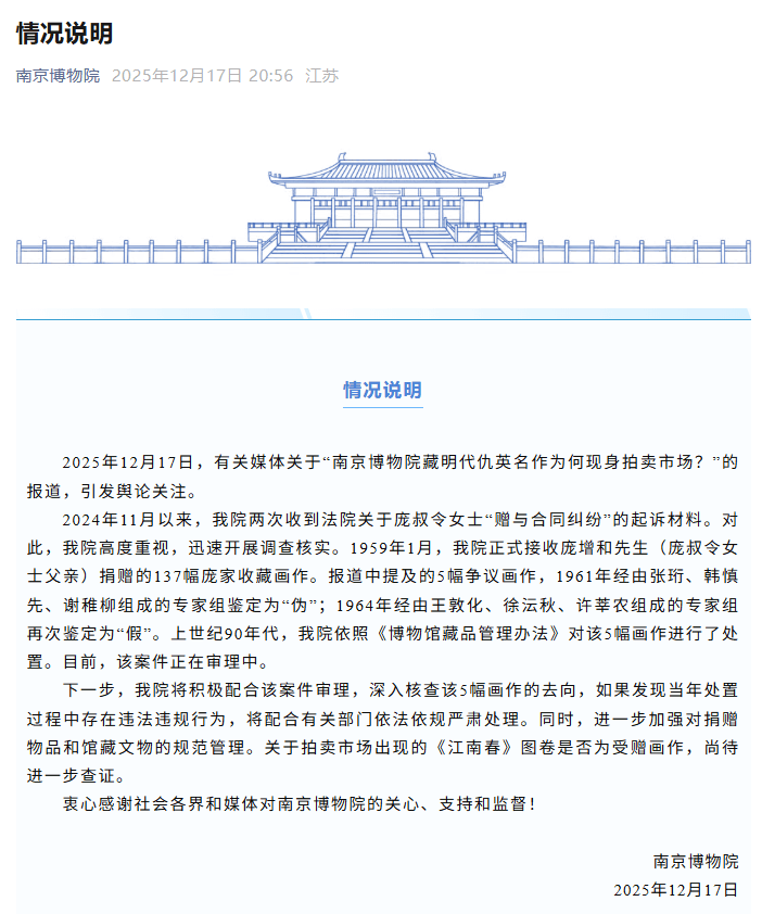 新京报讯 12月17日,南京博物院发布情况说明:2025年12月17日,有关媒体关于“南京博物院藏明代仇英名作为何现身拍卖市场?”的报道,引发舆论关注。