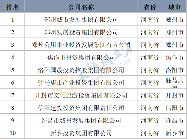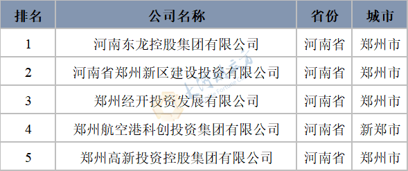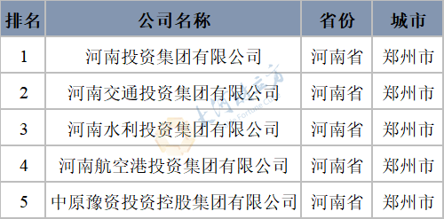 表1 河南省省级政府投融资平台排名情况(列示前5名)