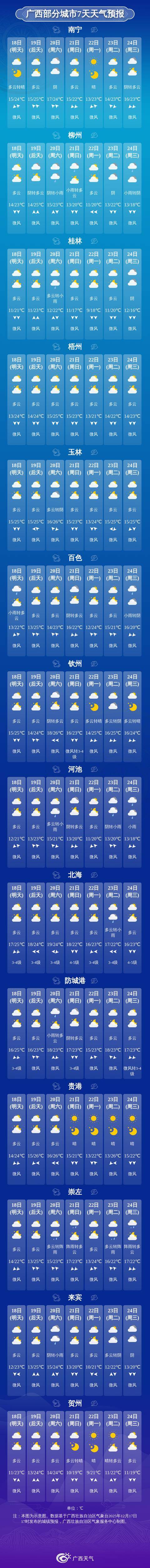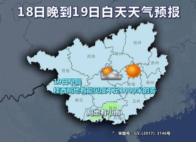 18日晚上到19日白天,全区多云间晴,其中桂南局地有小雨。19日早晨,桂西局地有能见度不足1000米的雾。