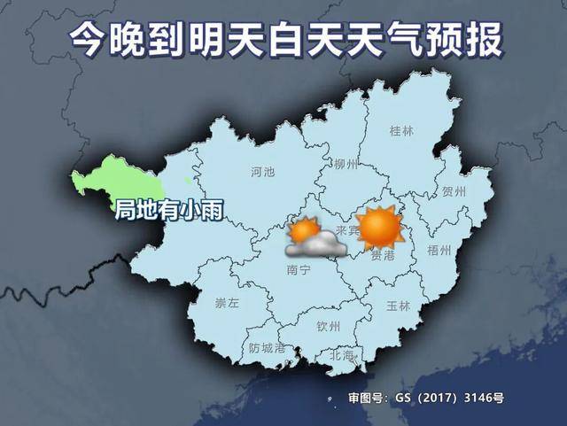 今天晚上到明天白天,全区多云到晴,其中百色市局地有小雨。