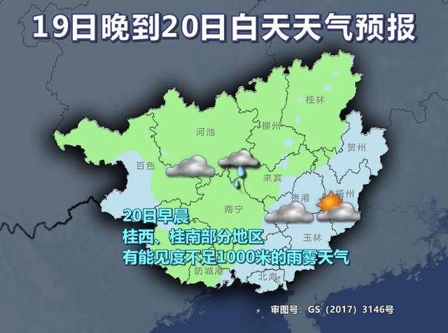 19日晚上到20日白天,桂北、桂西阴天有小雨,其它地区阴天到多云。20日早晨,桂西、桂南部分地区有能见度不足1000米的雨雾天气。
