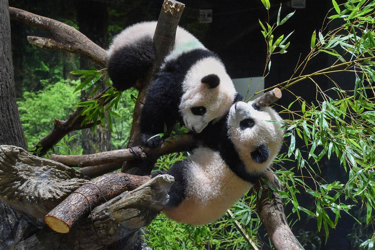 大熊猫“晓晓”(上)和“蕾蕾”(下)在日本东京上野动物园玩耍(图源:新华社)